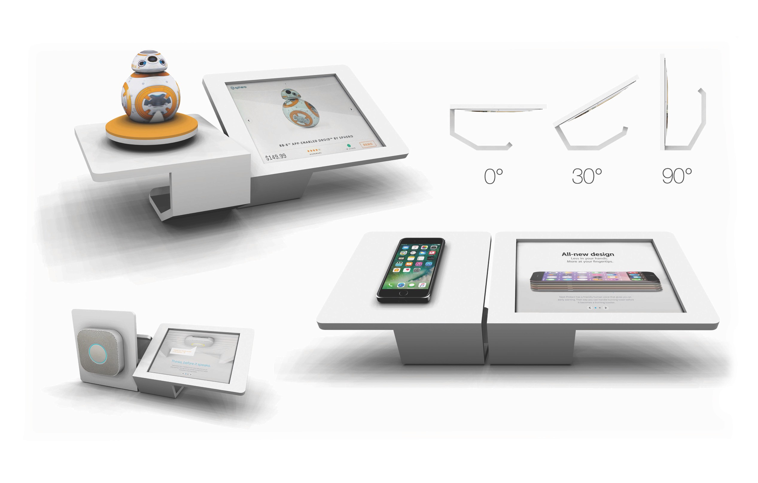 A modular counter display designed to showcase a variety of tech products.