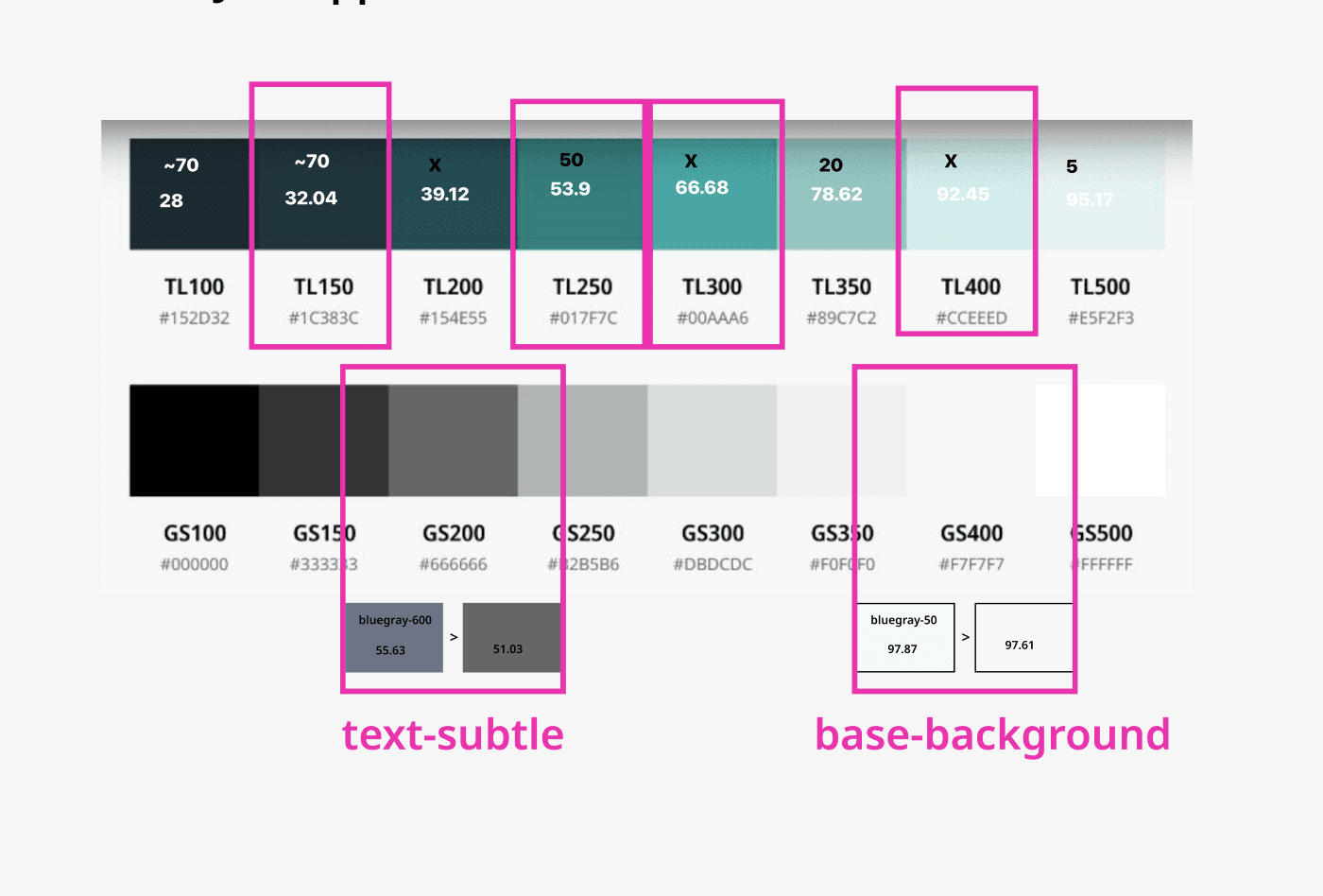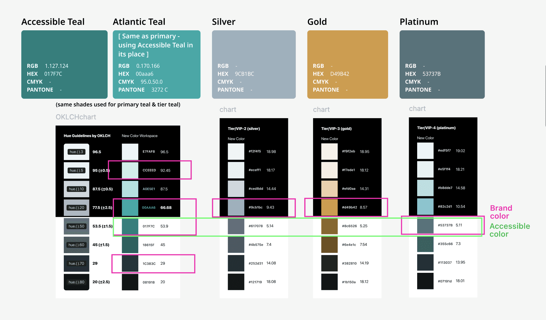 Color worksheets I created to bring partner colors into a standard set of hues and to test for accessibility.