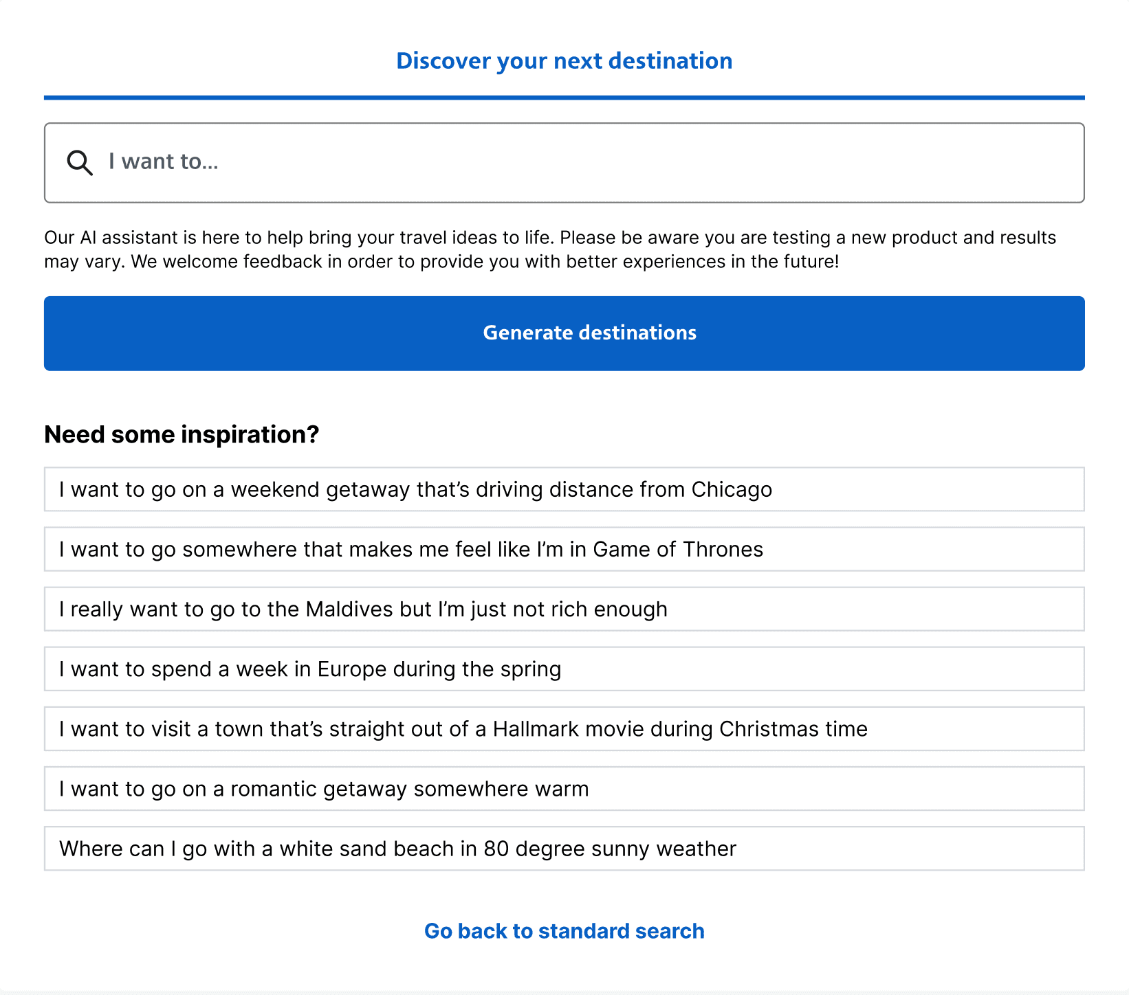 In a 2-day hackathon to brainstorm ways we could utilize AI in our travel booking products, my team and I came up with a feature that would help a user pinpoint where exactly their next vacation should be. View a full video demo at the bottom of this page.