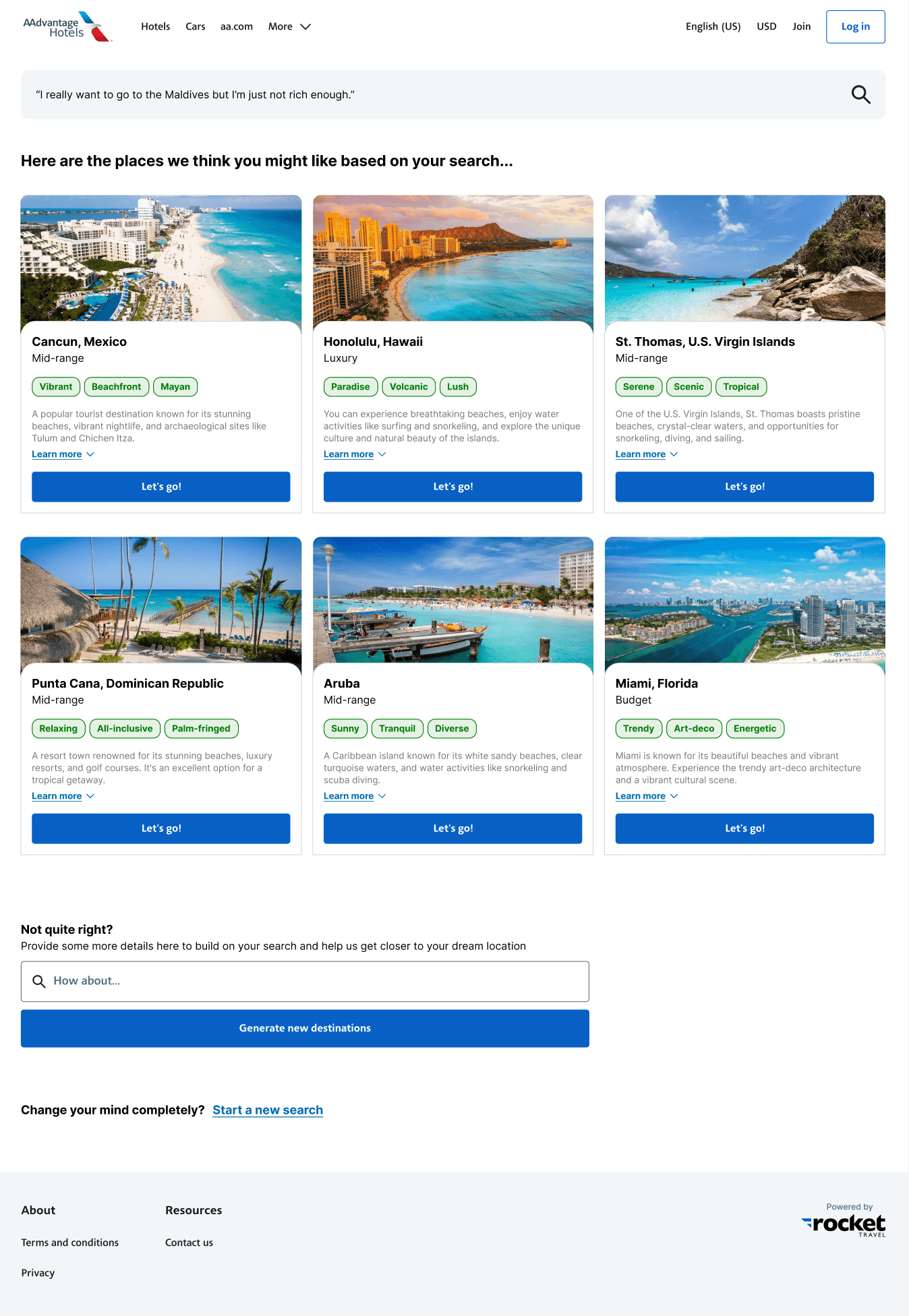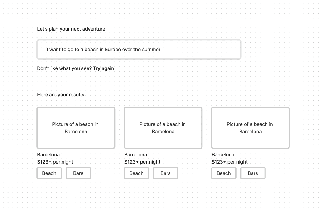 Users would be able to type in a prompt in the same way they would if they just simply used something like ChatGPT. But what would set this apart would be the per-partner customizability, the visual walkthrough, and the direct-to-platform tie-in. For example, if a user was on an American Airlines loyalty platform, then their results would be filtered only for locations served by American Airlines. Users are able to view a map, photos, and highlights of each suggested location immediately without having to open new tabs or ask for more details. Getting results of available hotels and prices directly as a next step is an additional convenience.