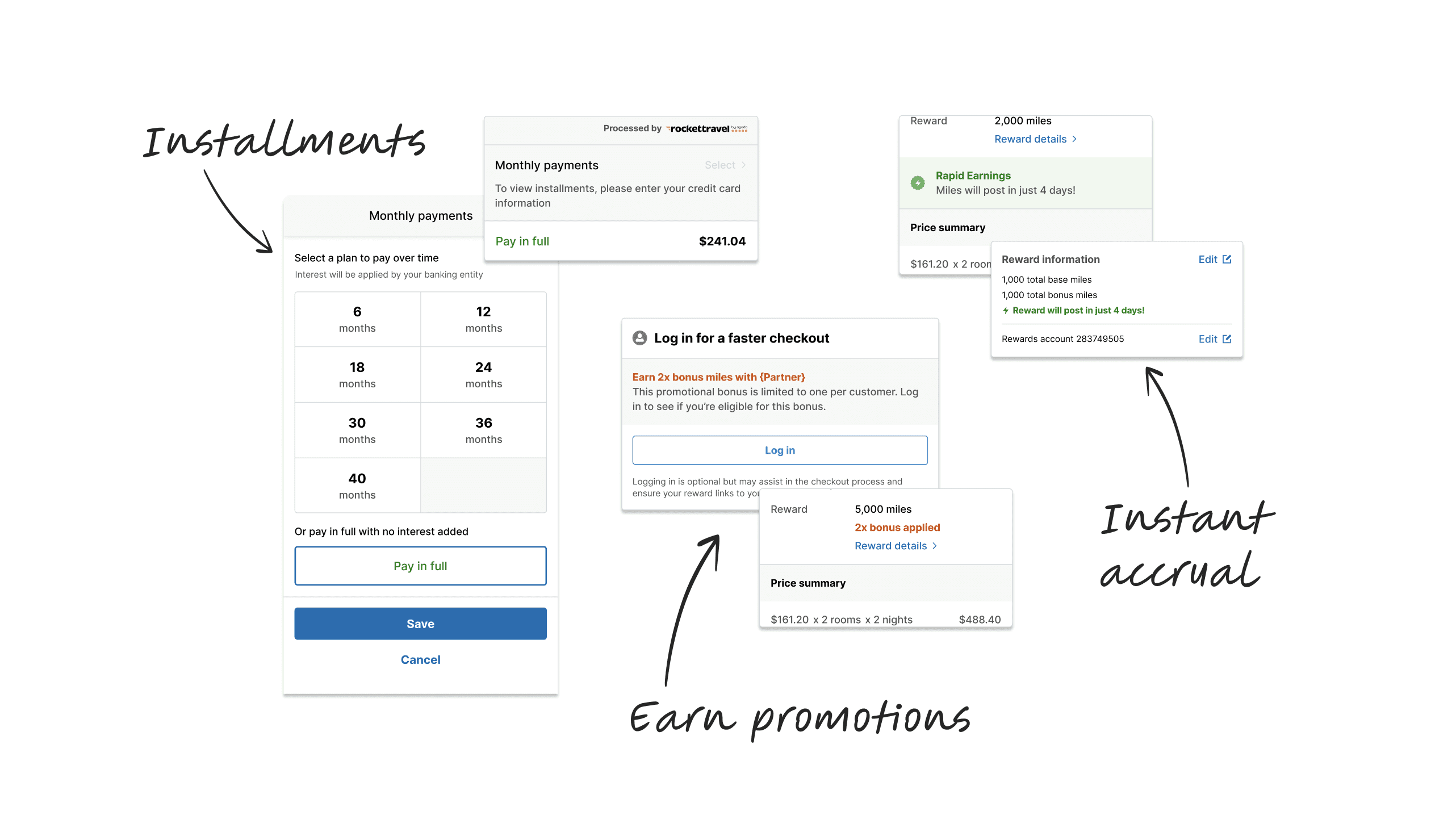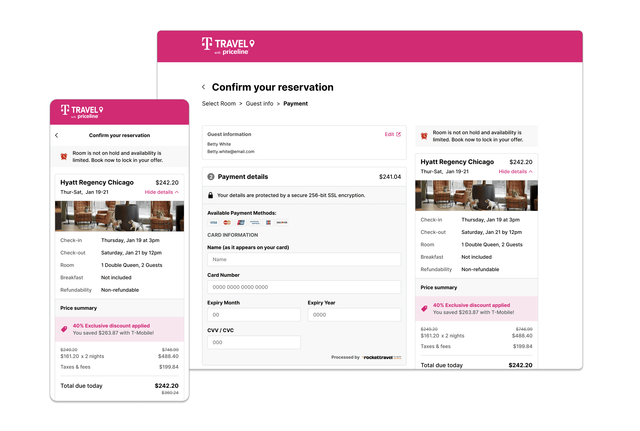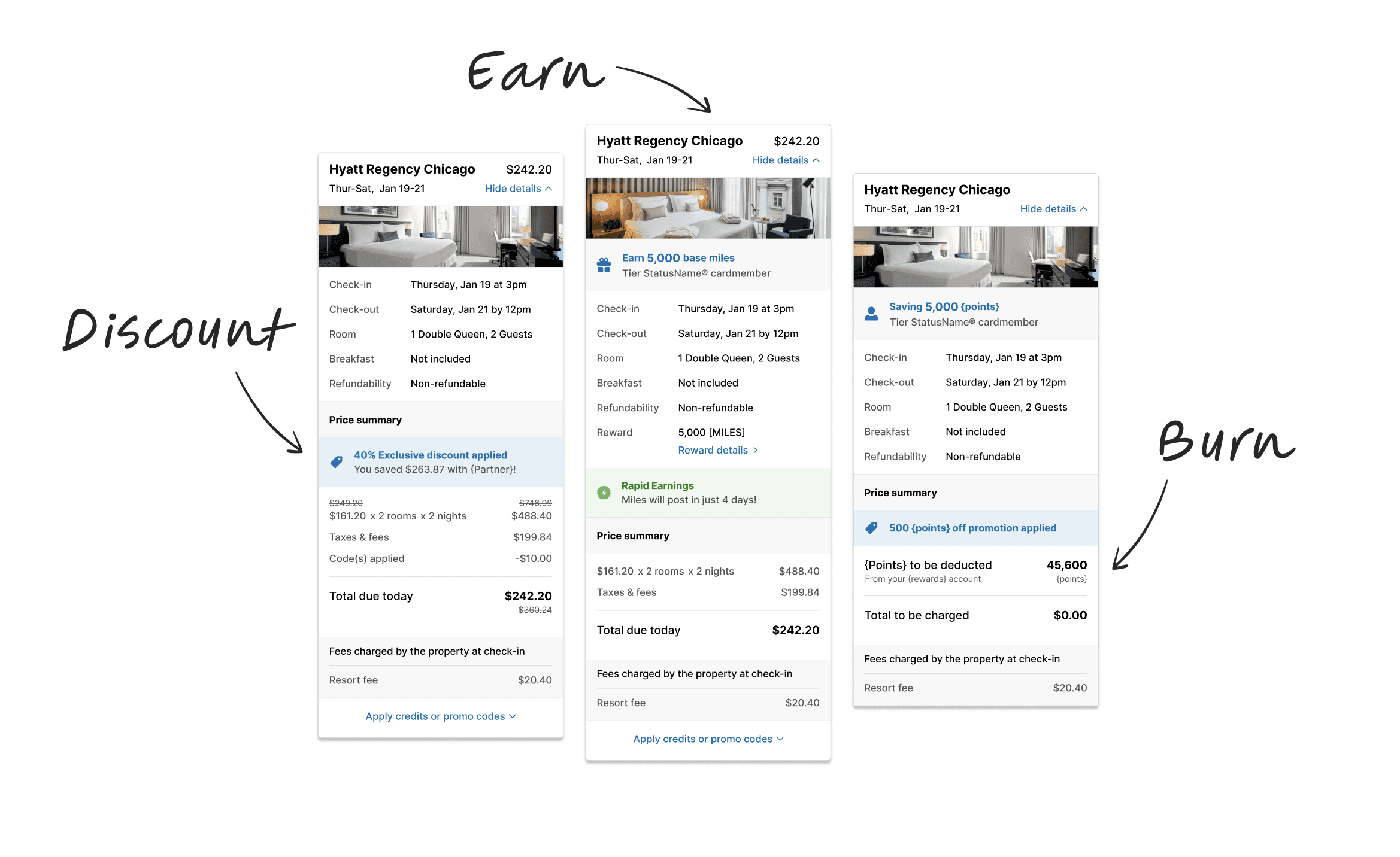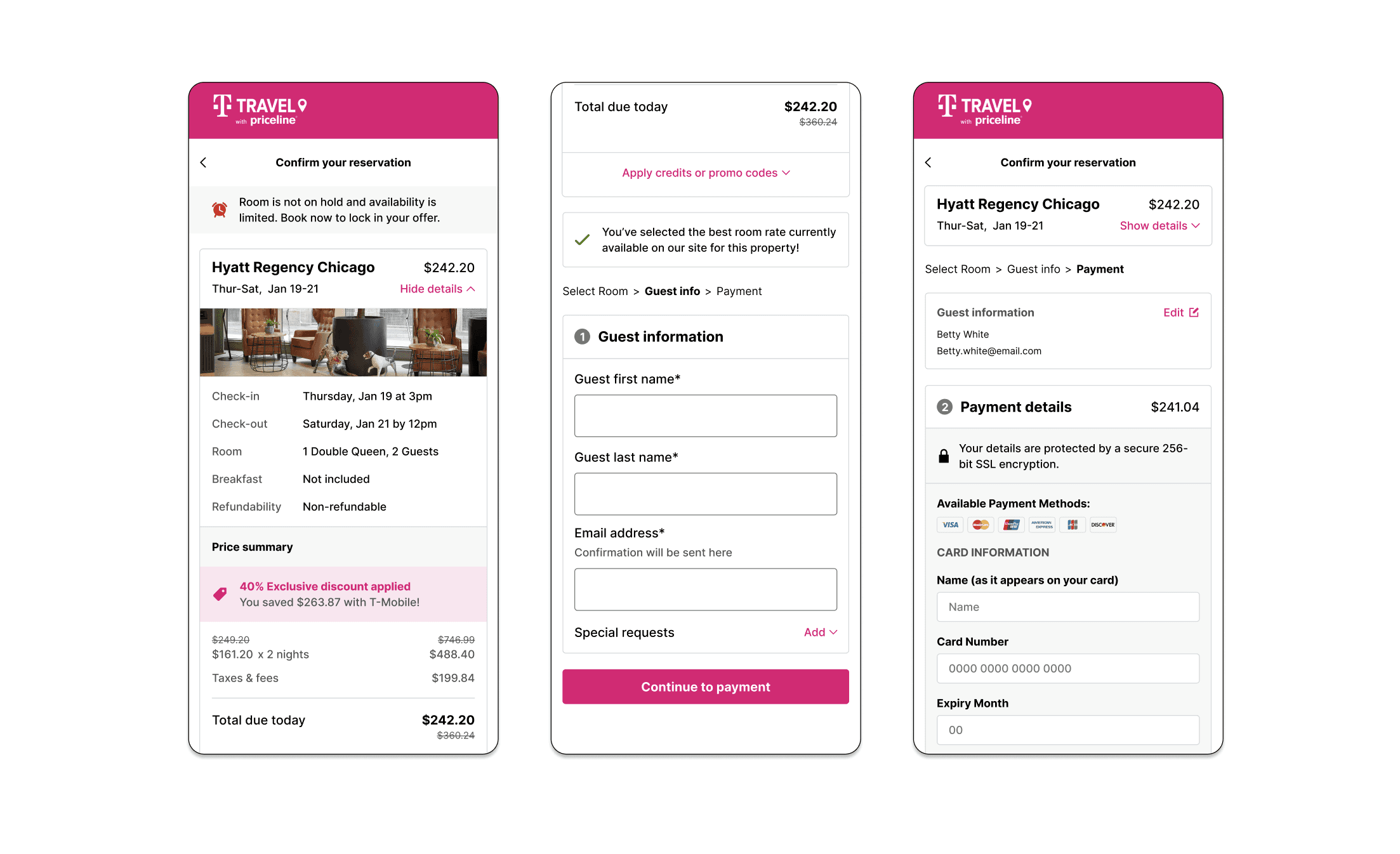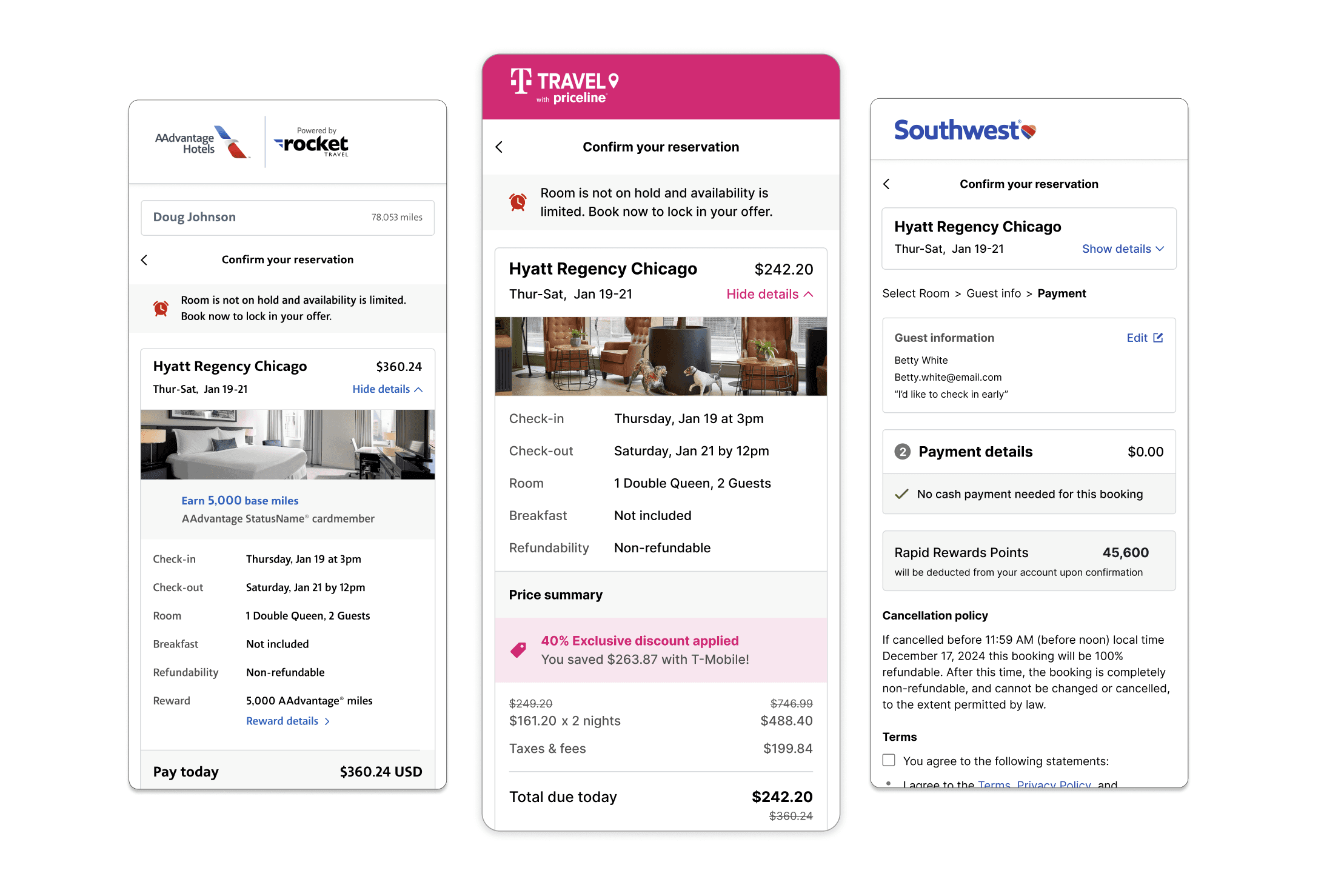 T-Mobile was considered a "discount" partner. Next, we solved for when a user earns rewards through checkout, and for when a user redeems rewards for their booking. These checkouts all used the same design system base, but each required unique details and features.