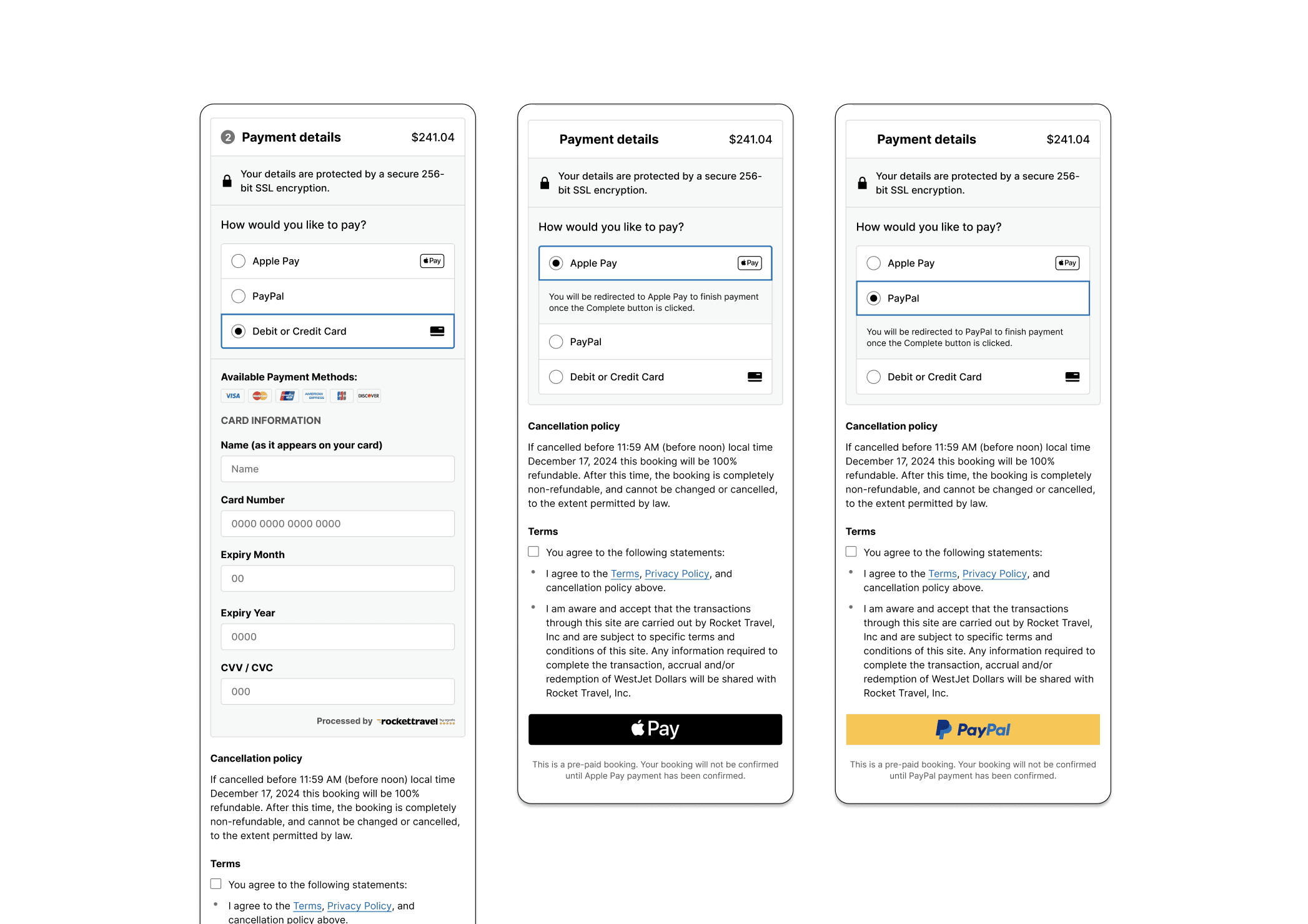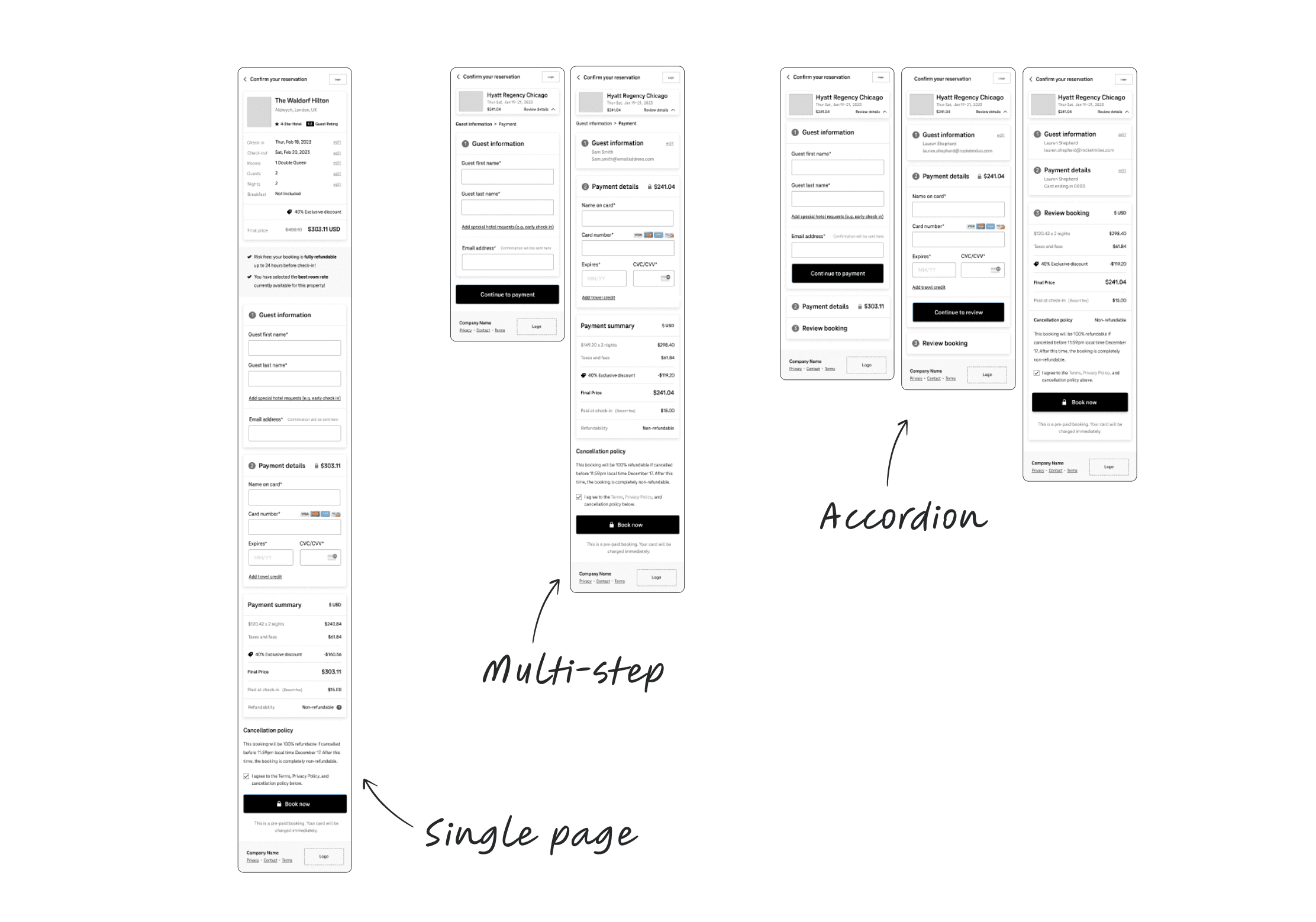 "The [multi-page] prototype is my favorite because payment was on a separate page which felt more secure. And it's easier on a tiny screen. I also appreciated that all of the details were there without having to open anything."